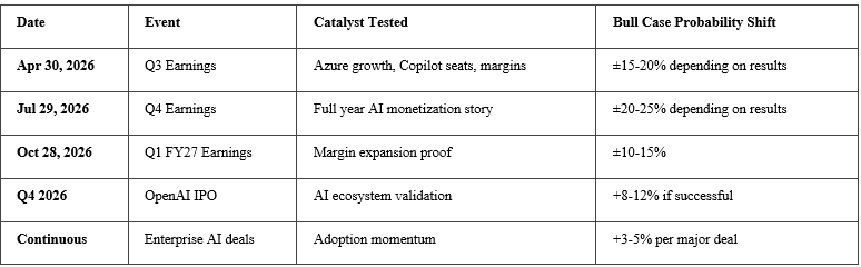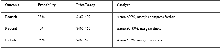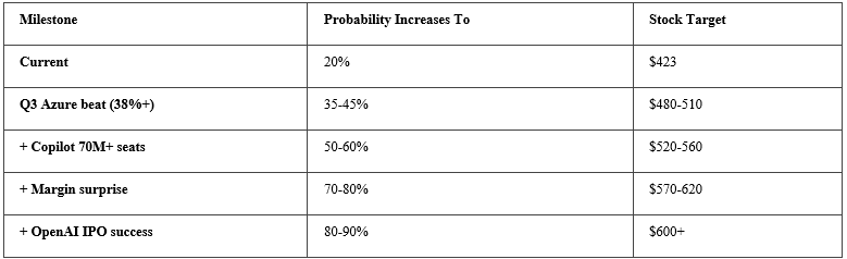Azure hits 38%+ (35% prob) × Copilot hits 75M+ (45% prob) × Margin surprise (25% prob) = 3.9% probability