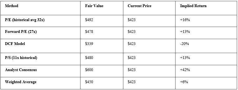 DCF Model Shows 25% Premium - Conservative cash flow analysis suggests fair value around $340-360, meaning current price already bakes in significant growth optimism