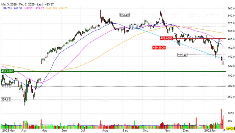 Weekly chart shows a breakdown from the $470-490 consolidation zone
