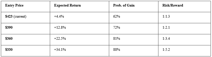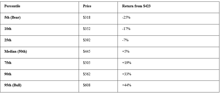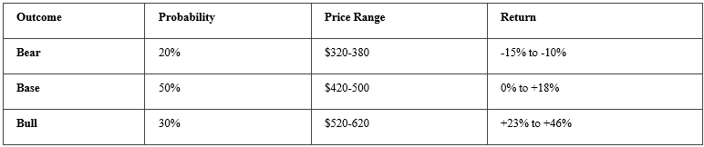 Starting Point: Current price $423, 20% probability of bull case